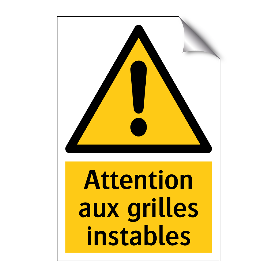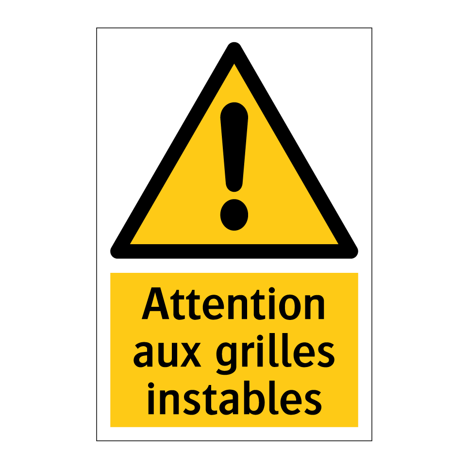 Panneau d'avertissement avec le texte : "Attention aux grilles instables"