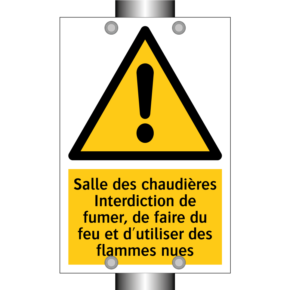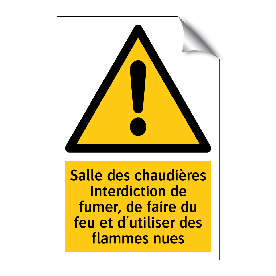 Panneau d'avertissement avec le texte : "Salle des chaudières Interdiction de fumer, de faire du feu et d'utiliser des flammes nues"