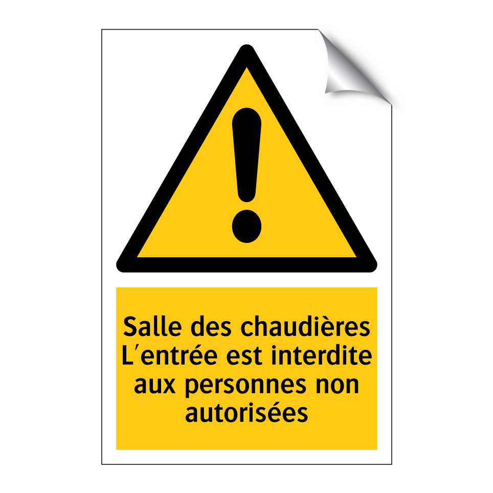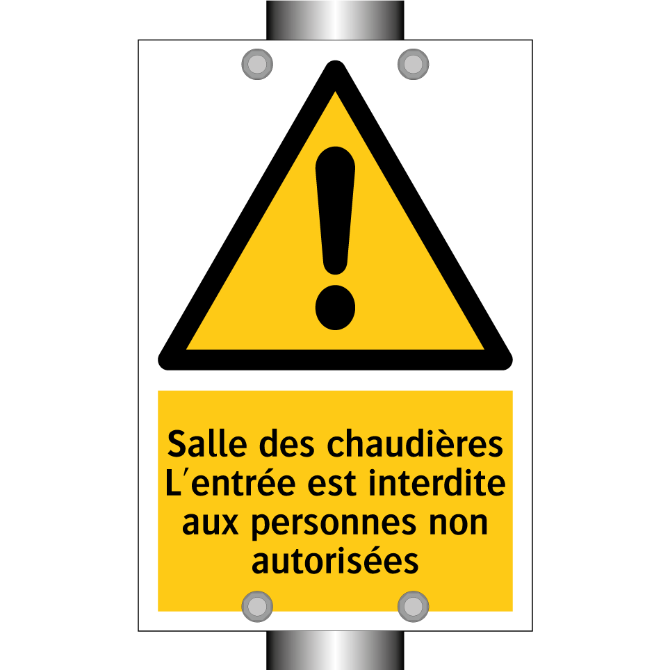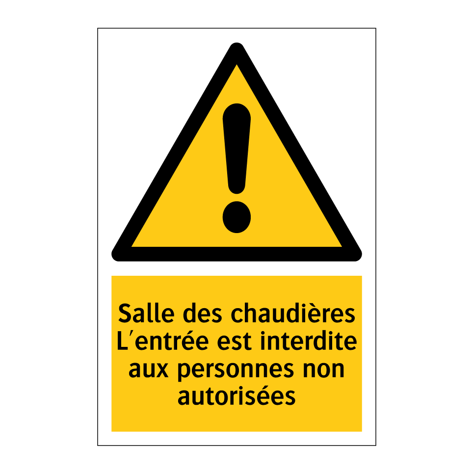 Panneau d'avertissement avec le texte : "Salle des chaudières L'entrée est interdite aux personnes non autorisées"