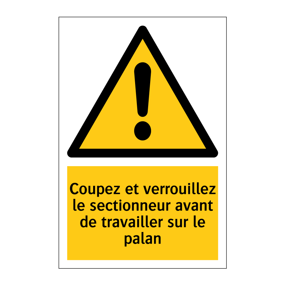 Panneau d'avertissement avec le texte : "Coupez et verrouillez le sectionneur avant de travailler sur le palan"