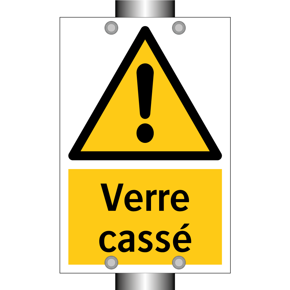 Panneau d'avertissement avec le texte : "Verre cassé"