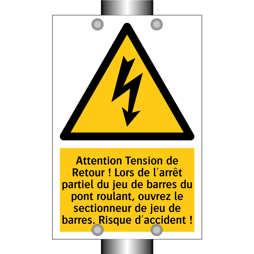 Panneau d'avertissement avec le texte : "Attention Tension de Retour ! Lors de l'arrêt partiel du jeu de barres du pont roulant, ouvrez le sectionneur de jeu de barres. Risque d'accident !"