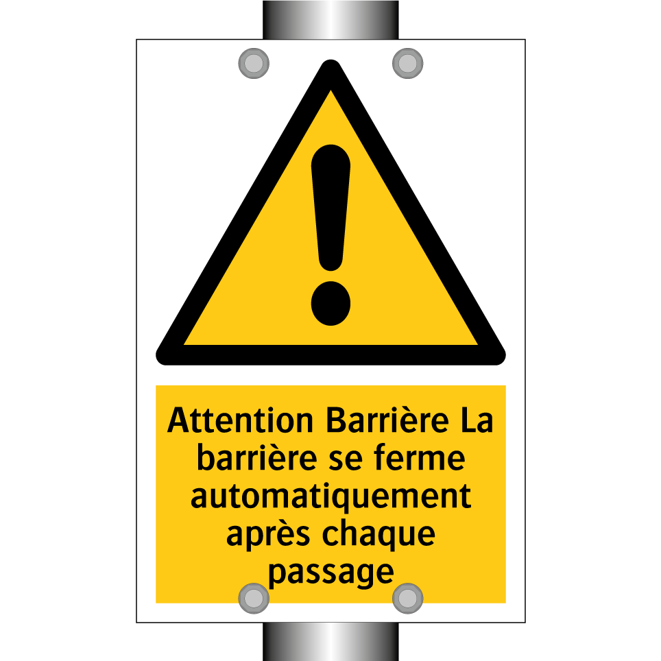 Panneau d'avertissement avec le texte : "Attention Barrière La barrière se ferme automatiquement après chaque passage"