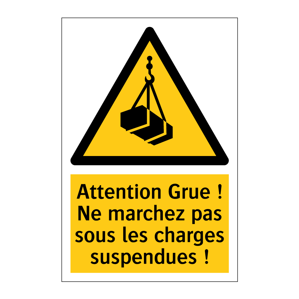 Panneau d'avertissement avec le texte : "Attention Grue ! Ne marchez pas sous les charges suspendues !"