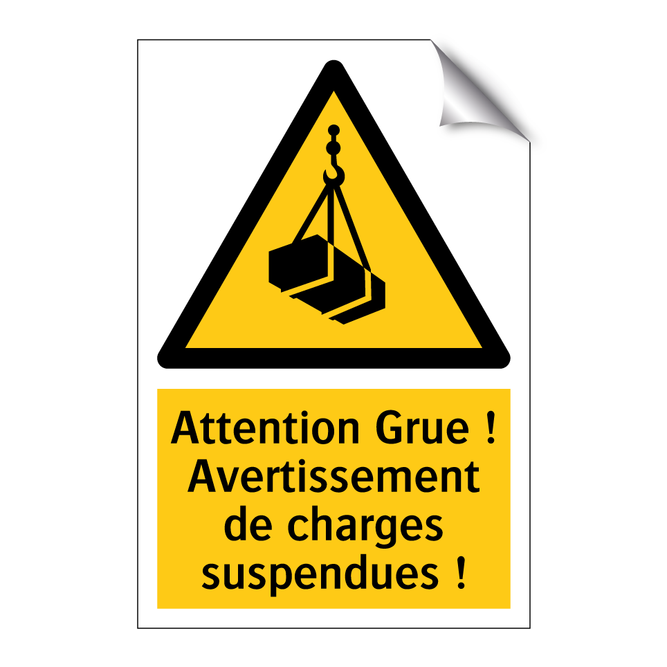 Panneau d'avertissement avec le texte : "Attention Grue ! Avertissement de charges suspendues !"