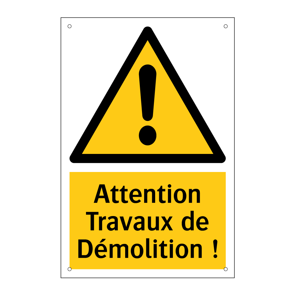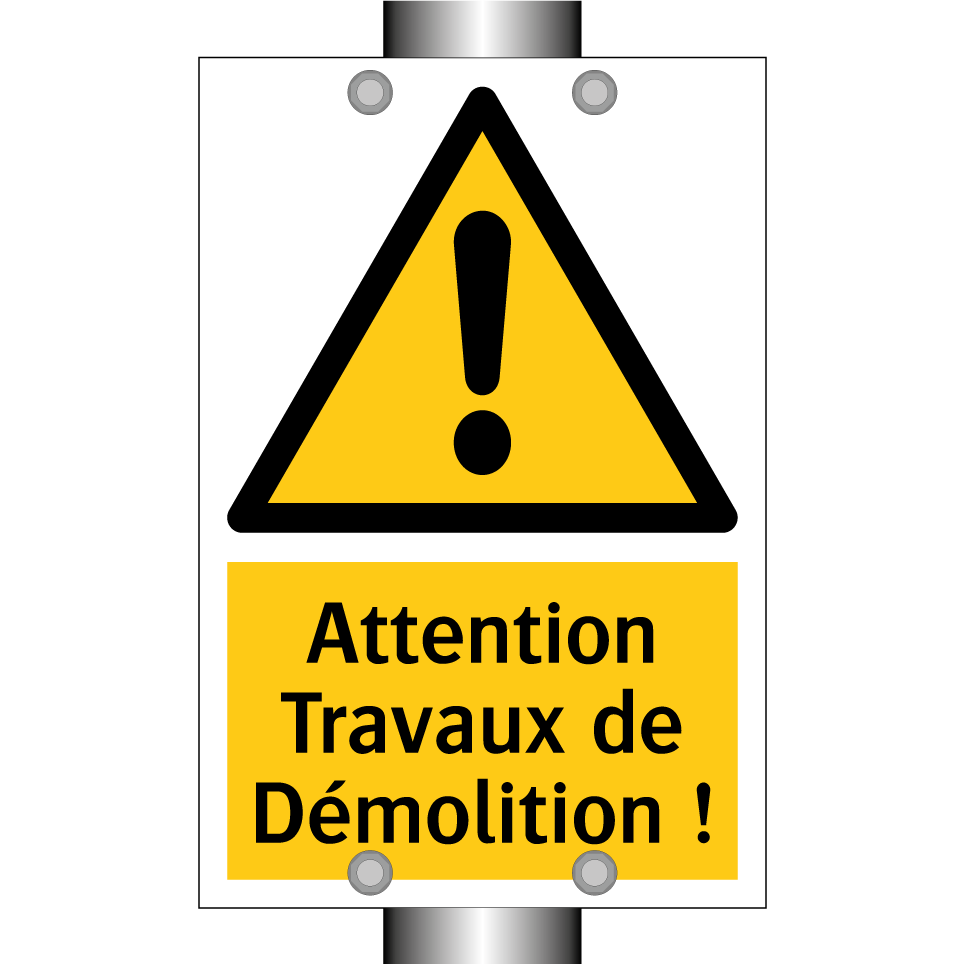 Panneau d'avertissement avec le texte : "Attention Travaux de Démolition !"