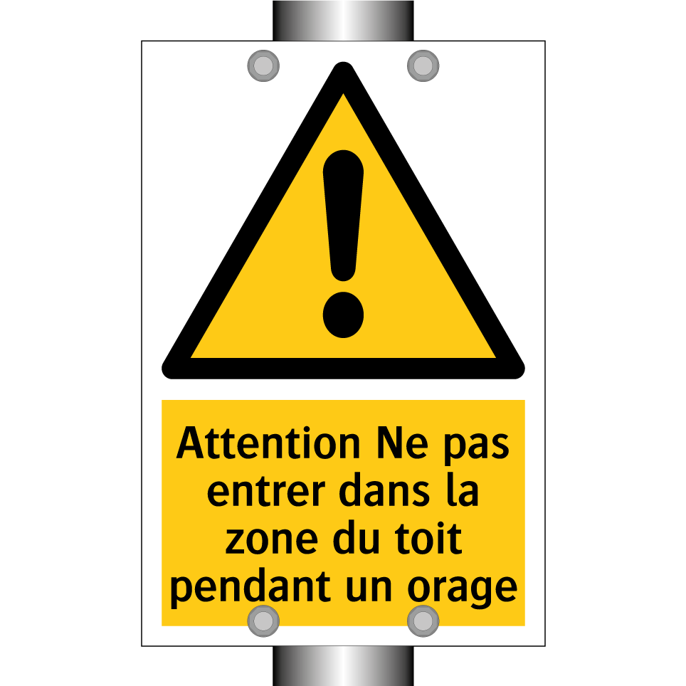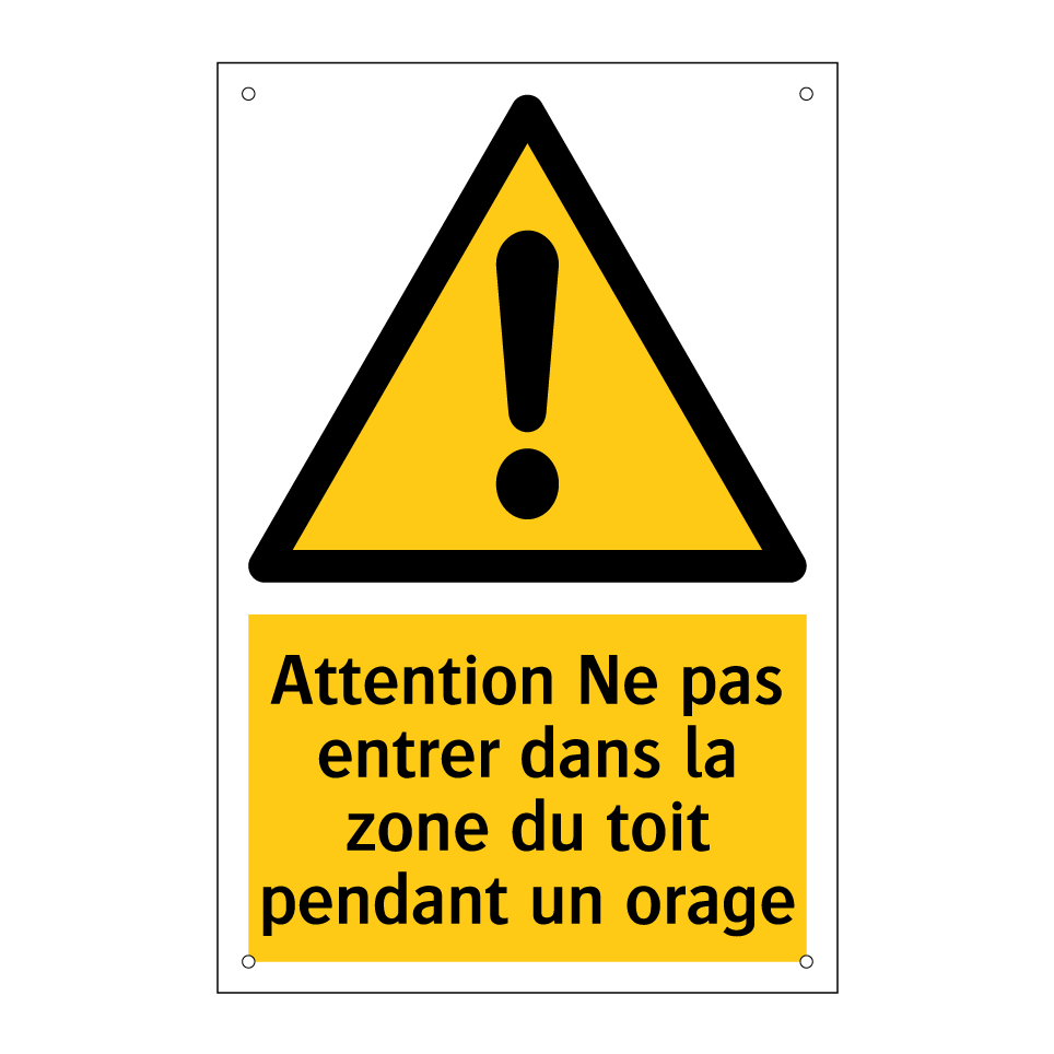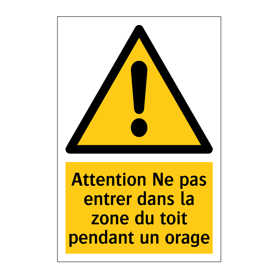 Panneau d'avertissement avec le texte : "Attention Ne pas entrer dans la zone du toit pendant un orage"