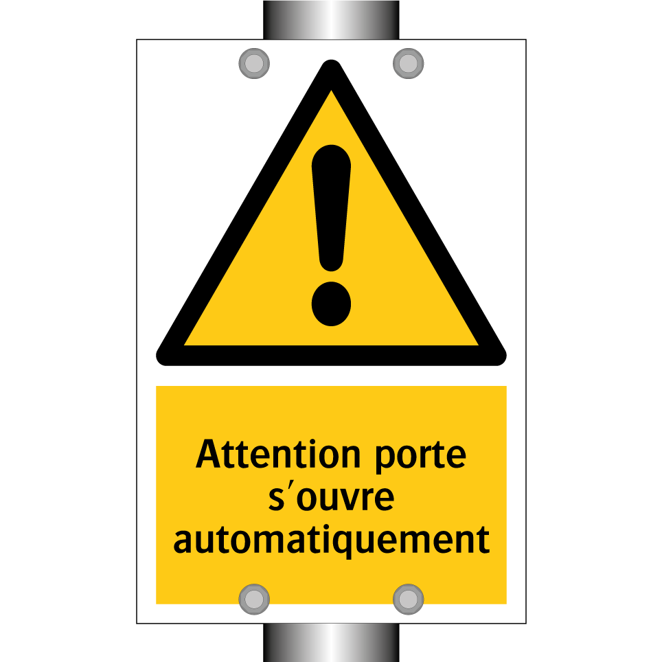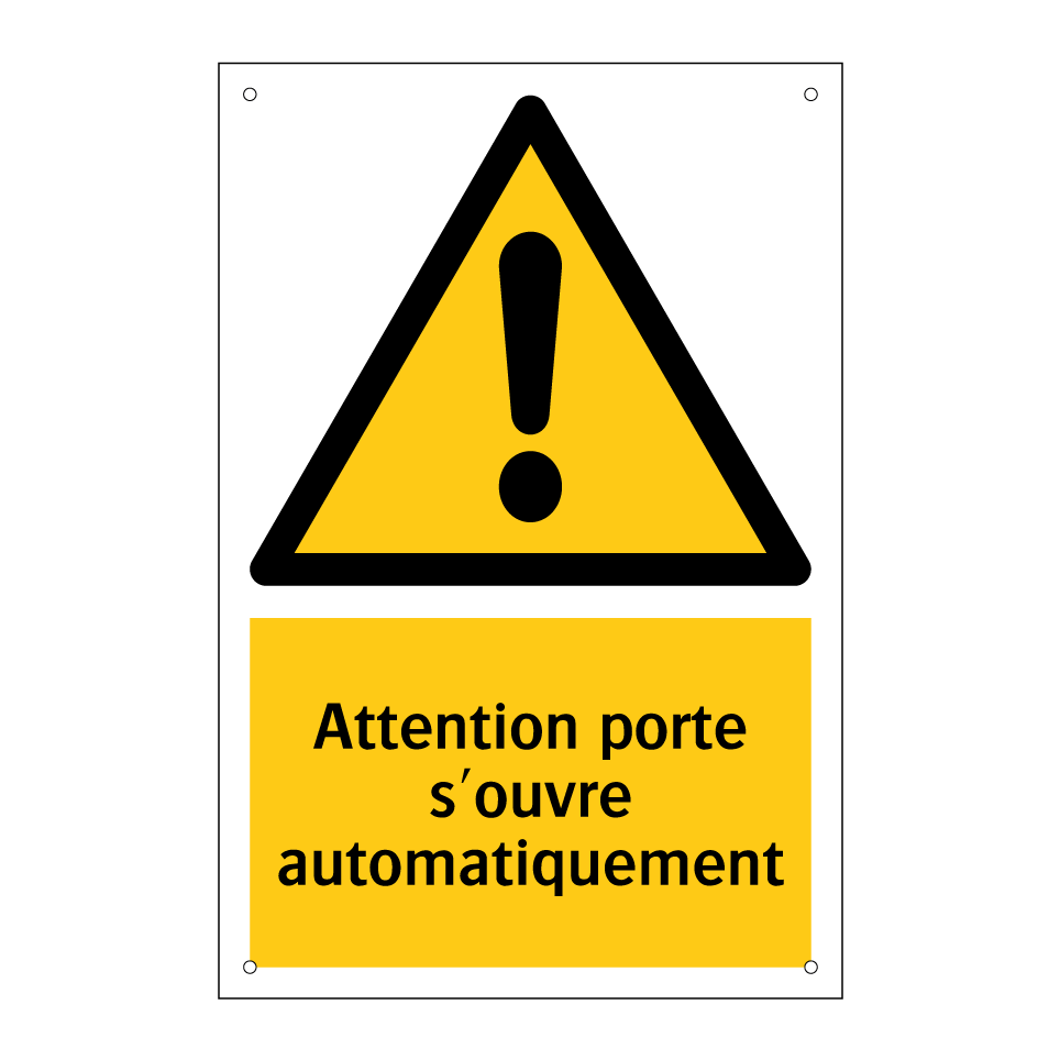 Panneau d'avertissement avec le texte : "Attention porte s'ouvre automatiquement"