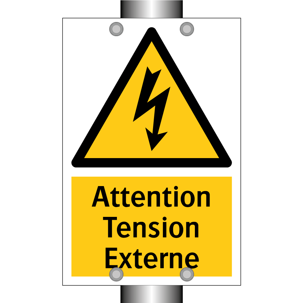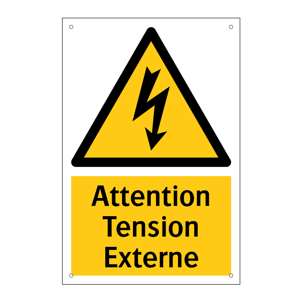 Panneau d'avertissement avec le texte : "Attention Tension Externe"