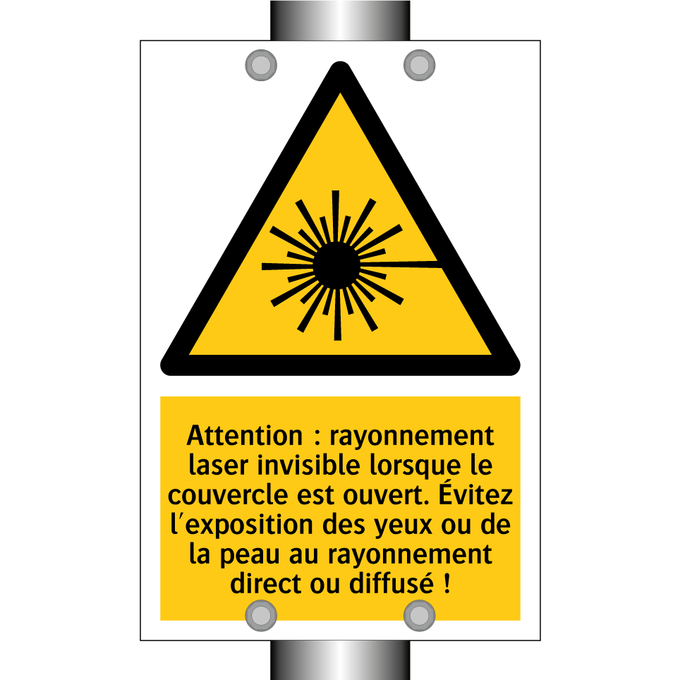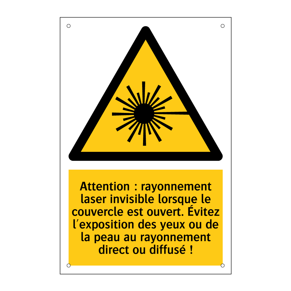 Panneau d'avertissement avec le texte : "Attention : rayonnement laser invisible lorsque le couvercle est ouvert. Évitez l'exposition des yeux ou de la peau au rayonnement direct ou diffusé !"