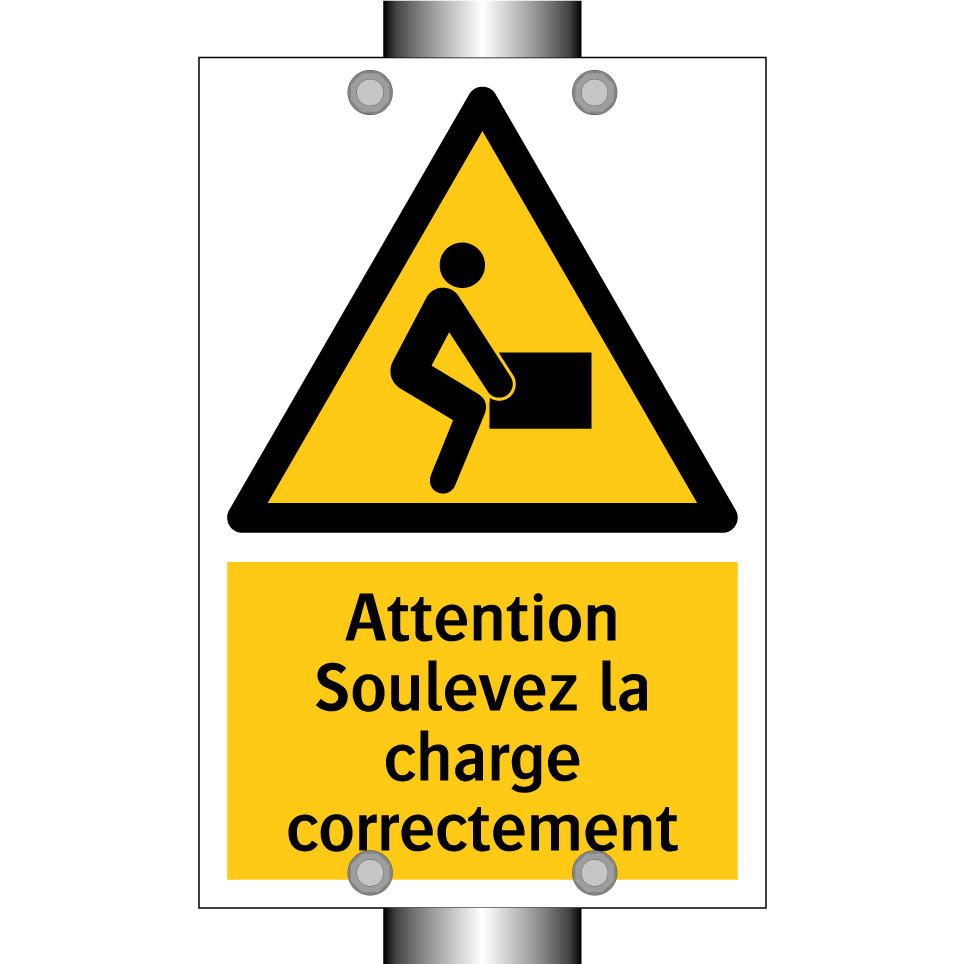 Panneau d'avertissement avec le texte : "Attention Soulevez la charge correctement"