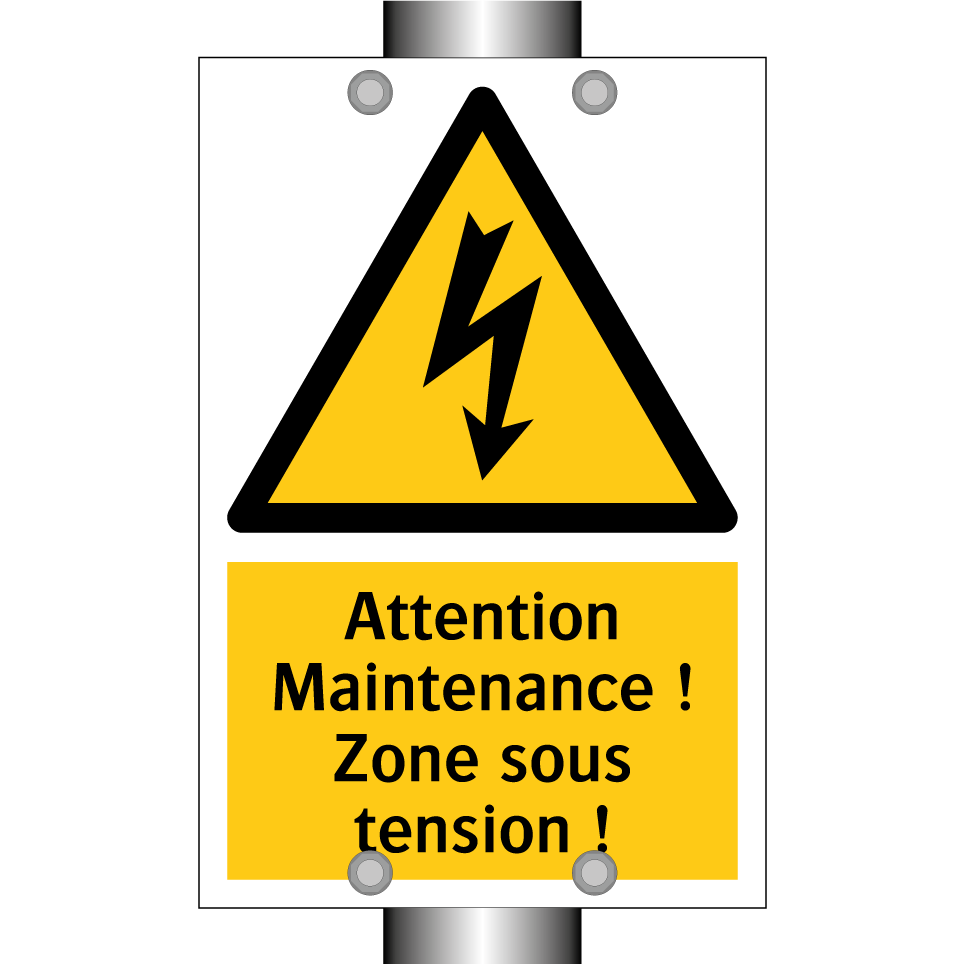 Panneau d'avertissement avec le texte : "Attention Maintenance ! Zone sous tension !"