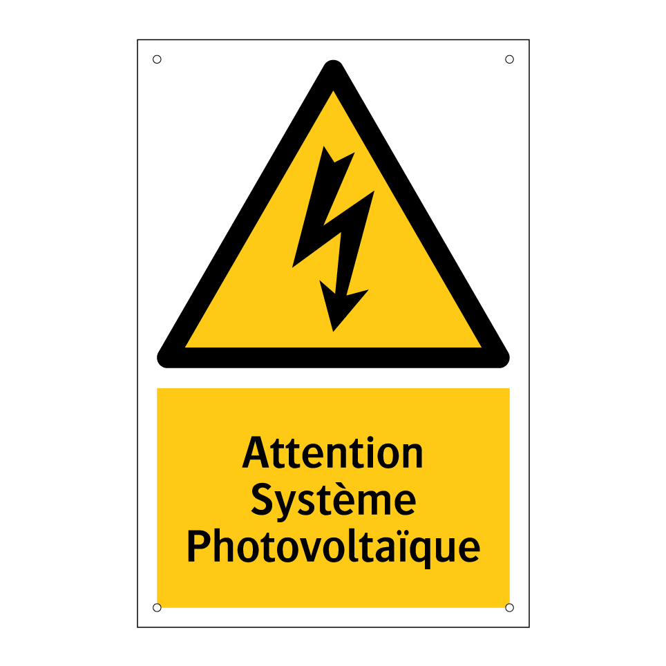 Panneau d'avertissement avec le texte : "Attention Système Photovoltaïque"