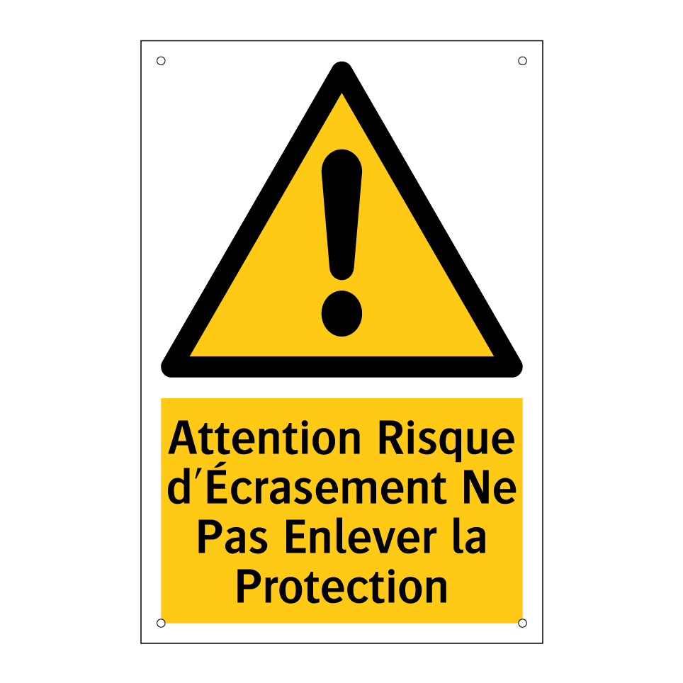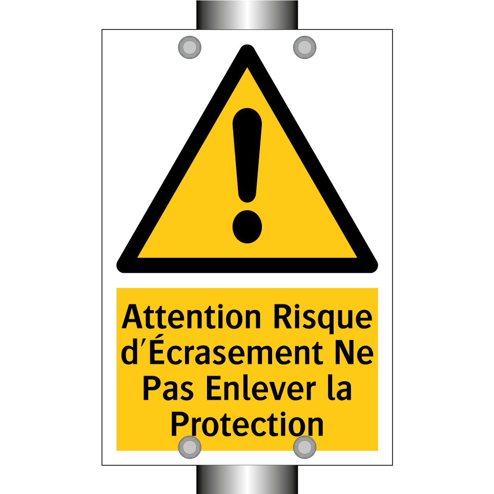 Panneau d'avertissement avec le texte : "Attention Risque d'Écrasement Ne Pas Enlever la Protection"
