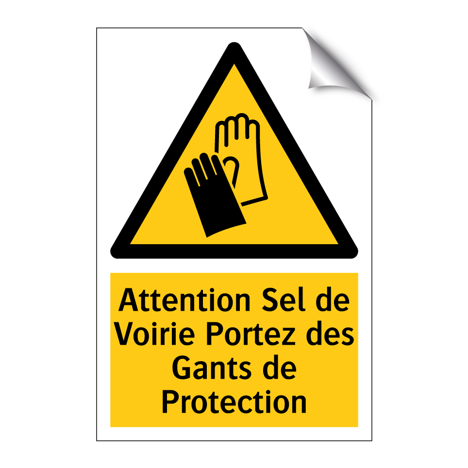 Panneau d'avertissement avec le texte : "Attention Sel de Voirie Portez des Gants de Protection"