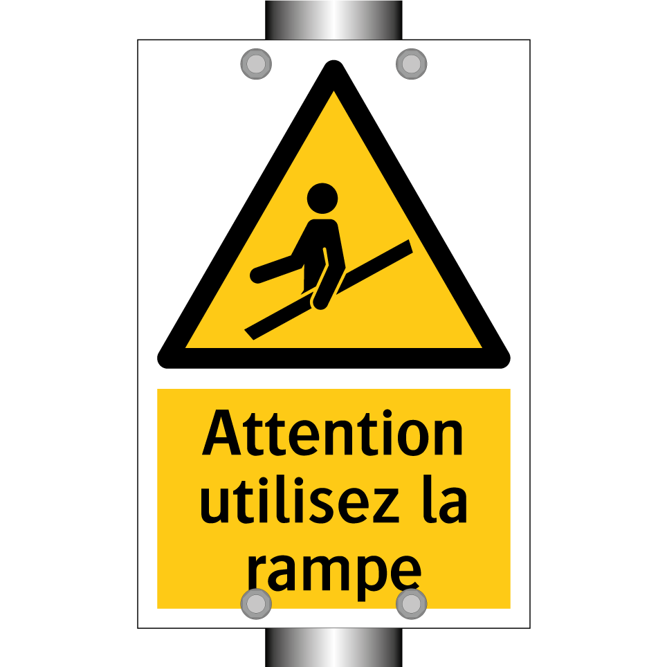 Panneau d'avertissement avec le texte : "Attention utilisez la rampe"