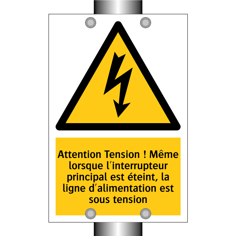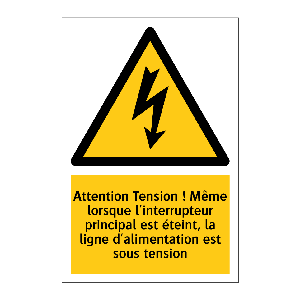 Panneau d'avertissement avec le texte : "Attention Tension ! Même lorsque l'interrupteur principal est éteint, la ligne d'alimentation est sous tension"