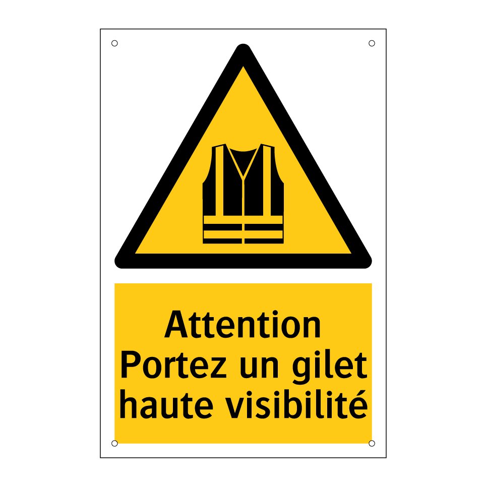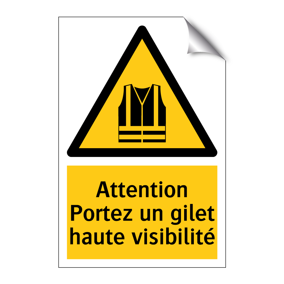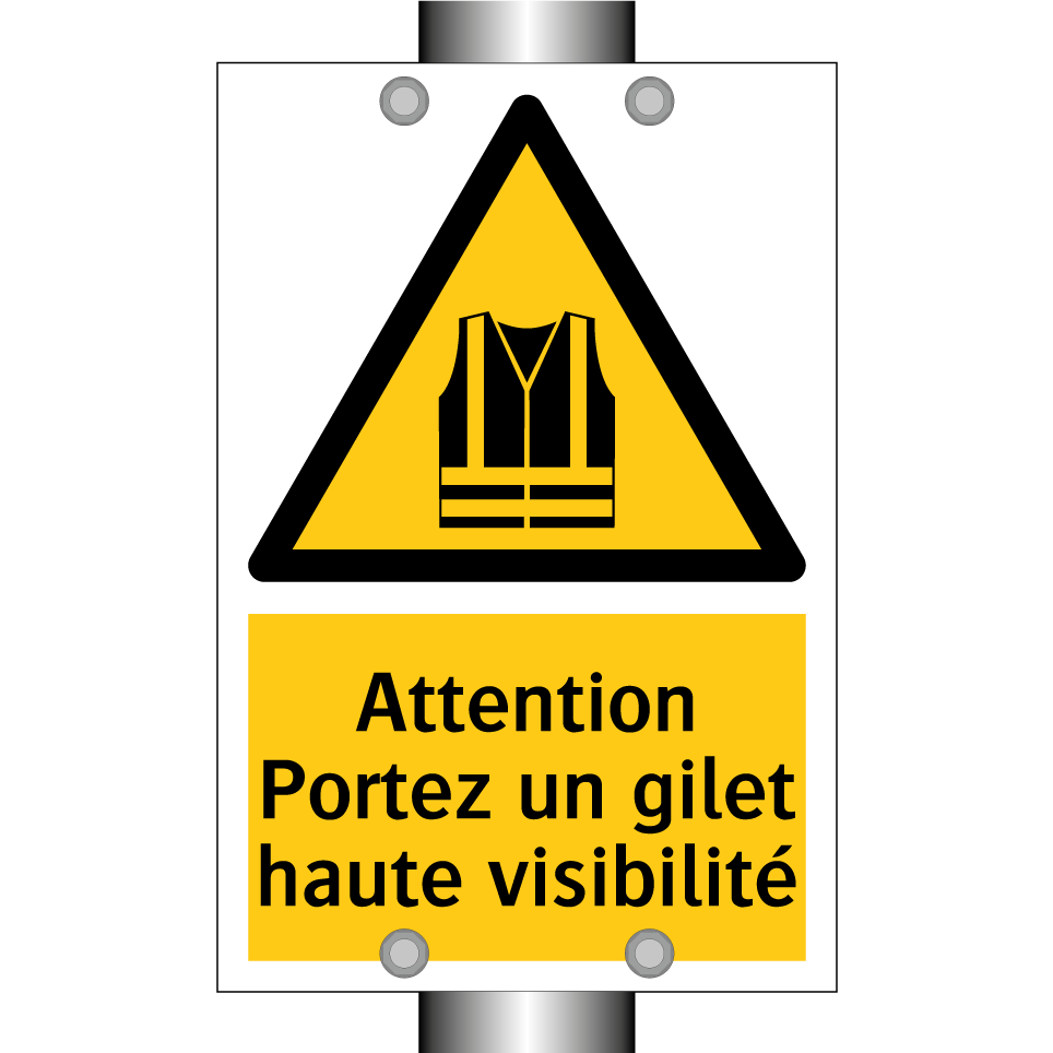 Panneau d'avertissement avec le texte : "Attention Portez un gilet haute visibilité"