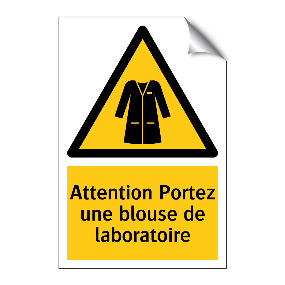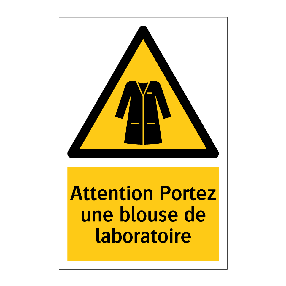 Panneau d'avertissement avec le texte : "Attention Portez une blouse de laboratoire"