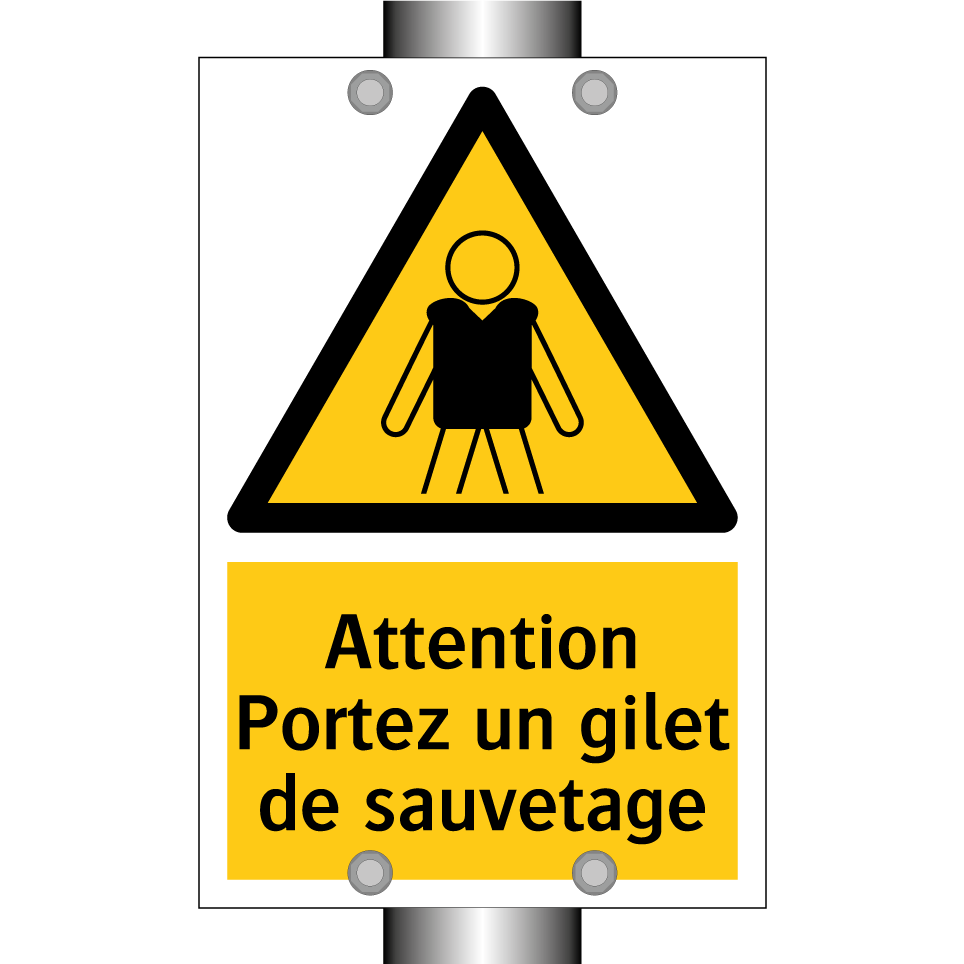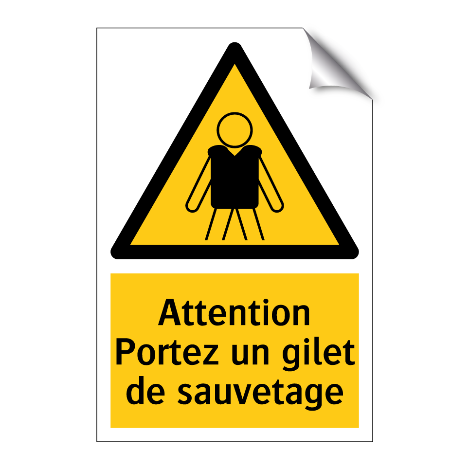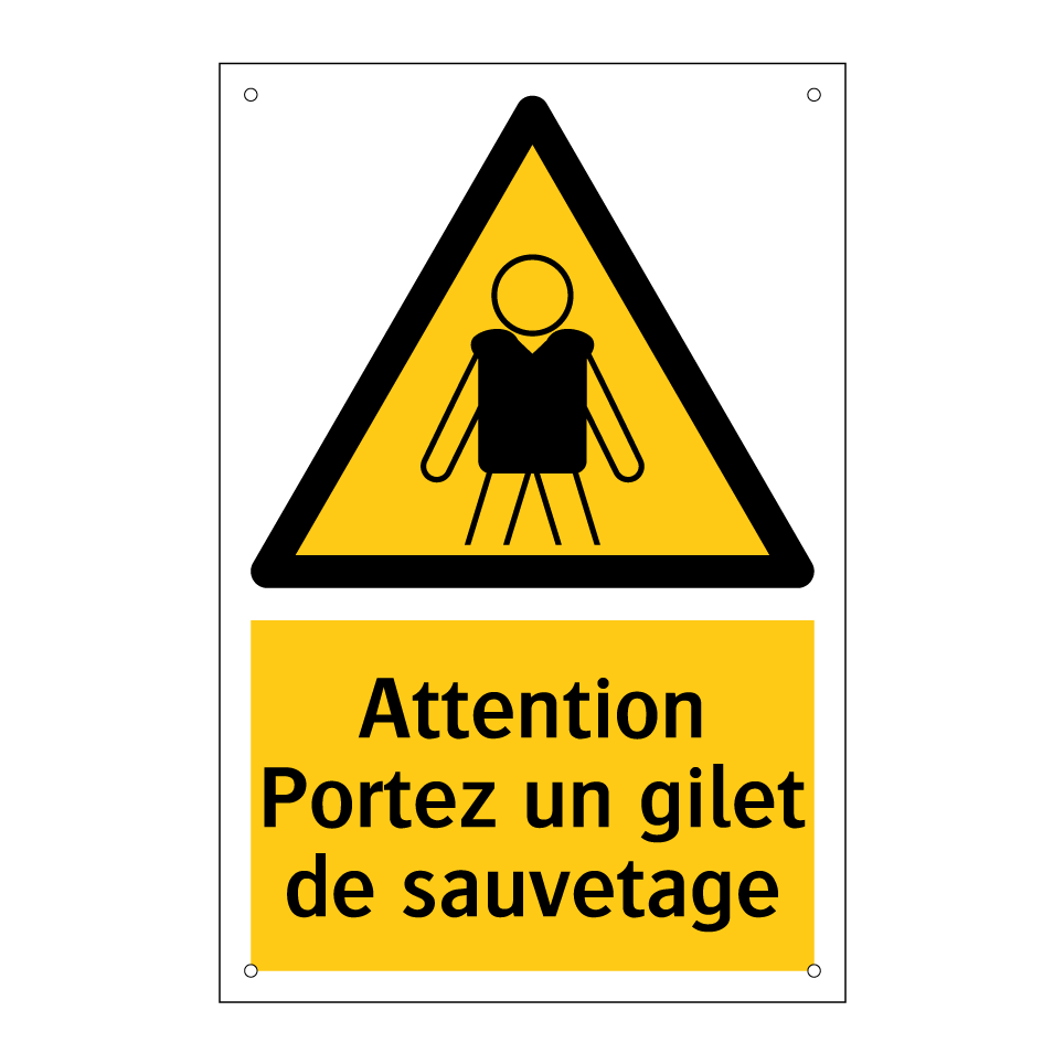 Panneau d'avertissement avec le texte : "Attention Portez un gilet de sauvetage"