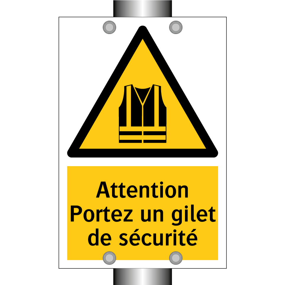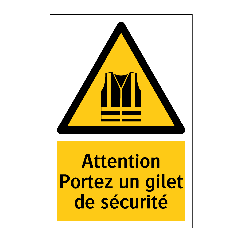 Panneau d'avertissement avec le texte : "Attention Portez un gilet de sécurité"