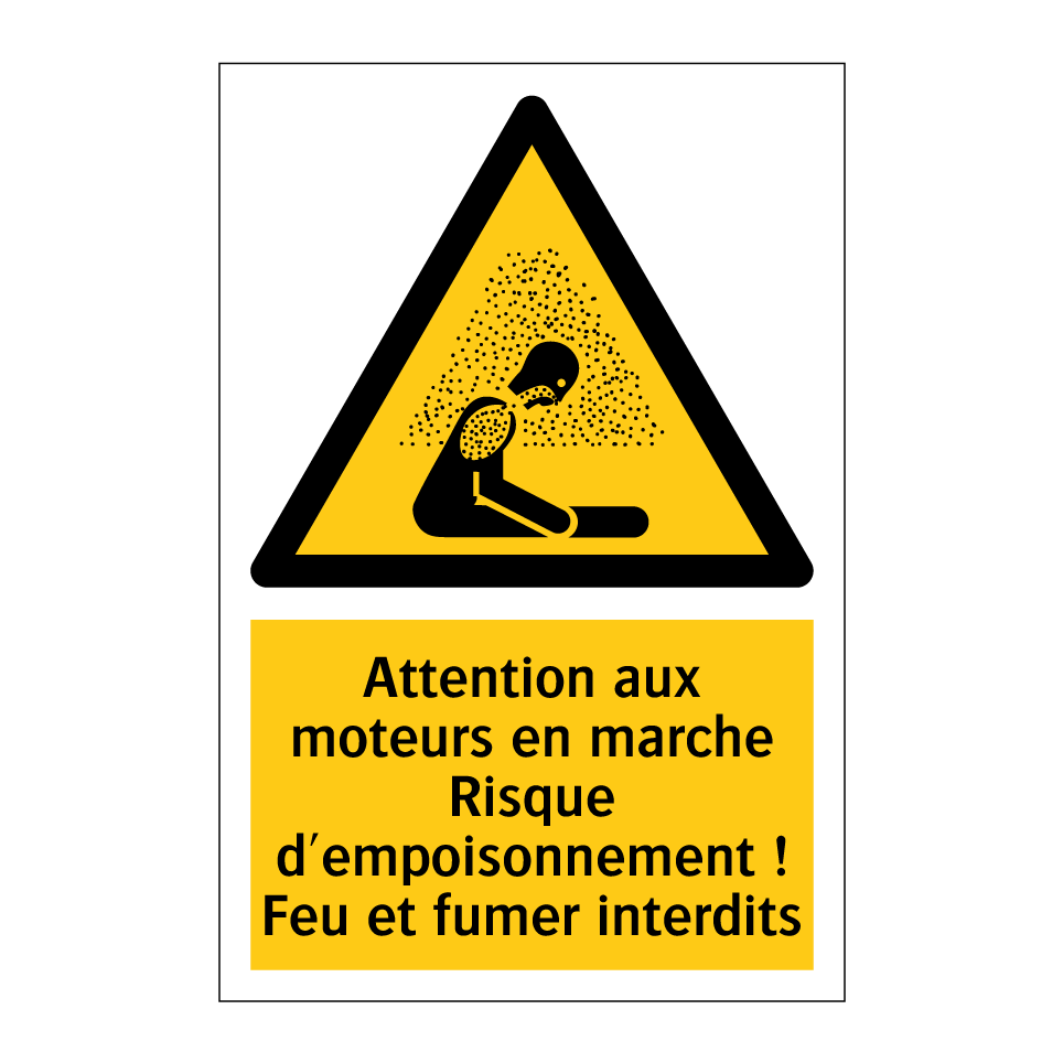 Panneau d'avertissement avec le texte : "Attention aux moteurs en marche Risque d'empoisonnement ! Feu et fumer interdits"