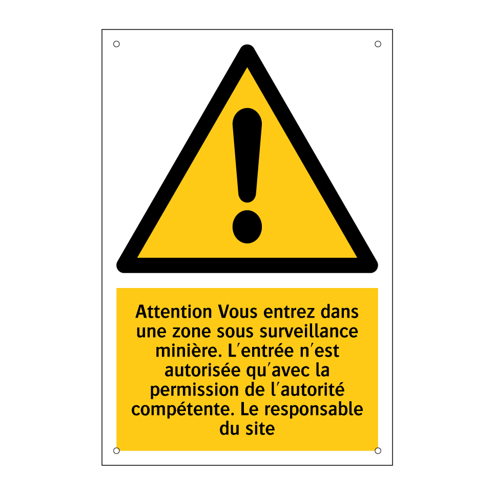 Panneau d'avertissement avec le texte : "Attention Vous entrez dans une zone sous surveillance minière. L'entrée n'est autorisée qu'avec la permission de l'autorité compétente. Le responsable du site"