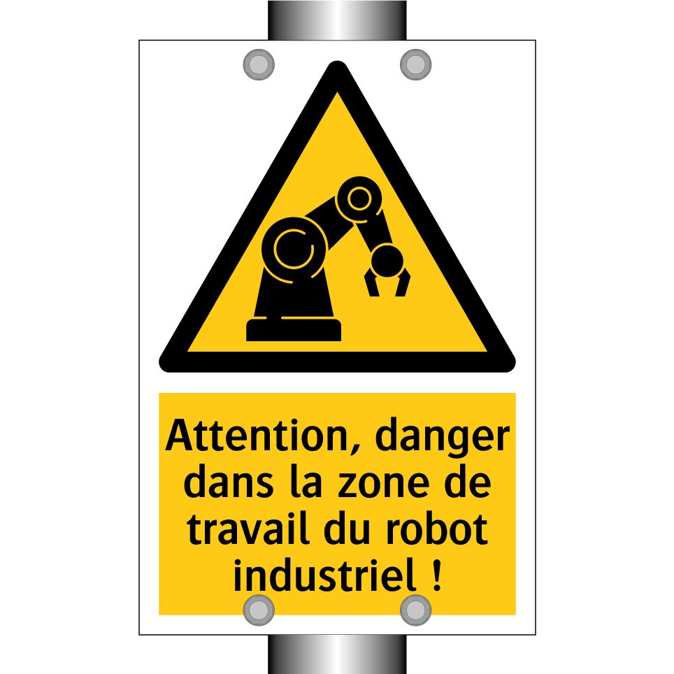 Panneau d'avertissement avec le texte : "Attention, danger dans la zone de travail du robot industriel !"