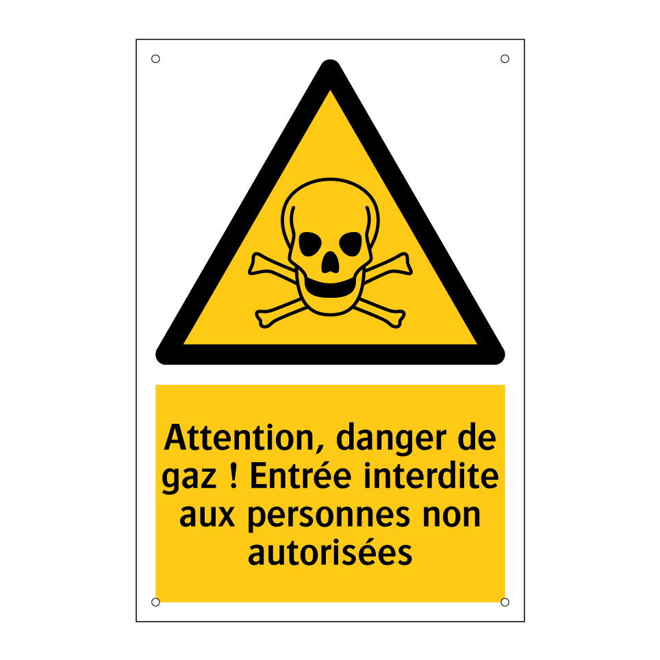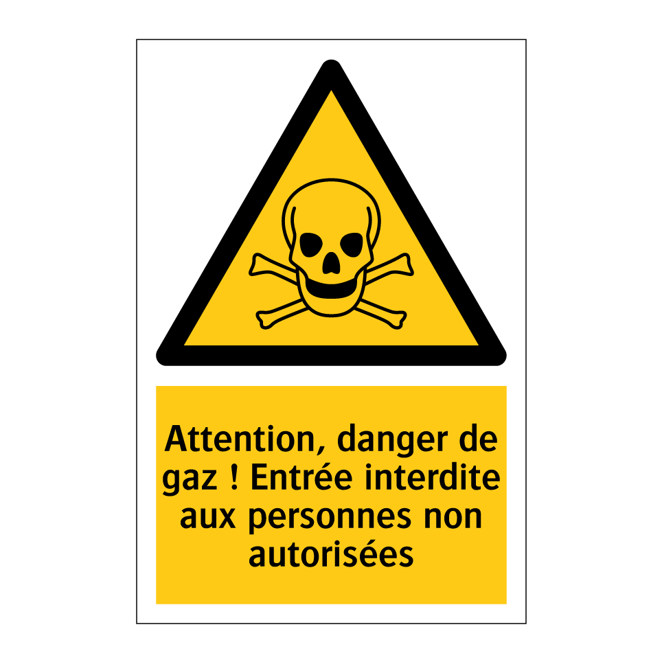Panneau d'avertissement avec le texte : "Attention, danger de gaz ! Entrée interdite aux personnes non autorisées"