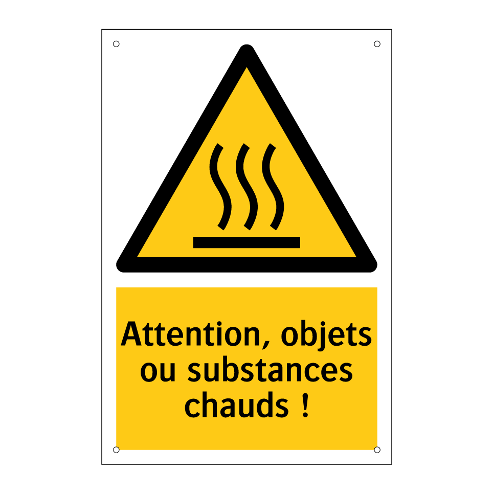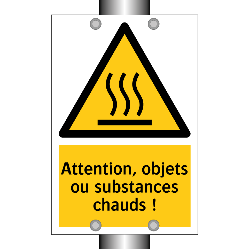 Panneau d'avertissement avec le texte : "Attention, objets ou substances chauds !"
