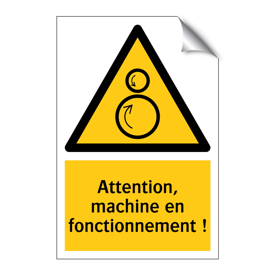 Panneau d'avertissement avec le texte : "Attention, machine en fonctionnement !"
