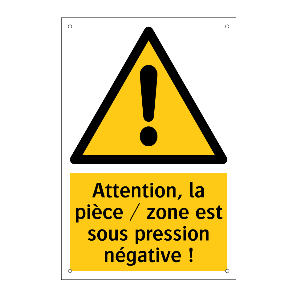 Panneau d'avertissement avec le texte : "Attention, la pièce / zone est sous pression négative !"