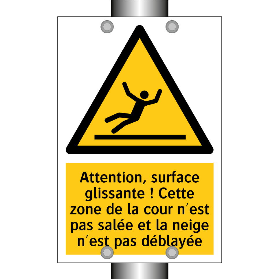 Panneau d'avertissement avec le texte : "Attention, surface glissante ! Cette zone de la cour n'est pas salée et la neige n'est pas déblayée"