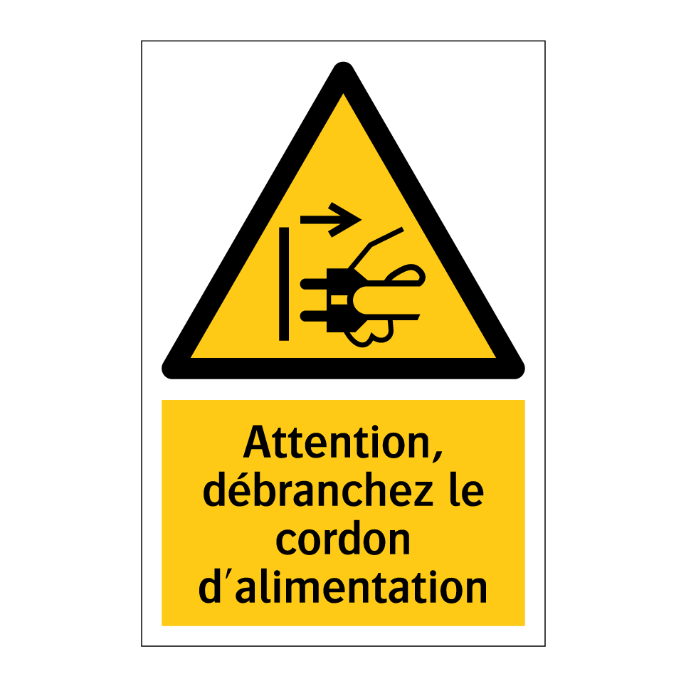Panneau d'avertissement avec le texte : "Attention, débranchez le cordon d'alimentation"