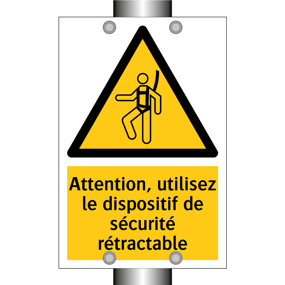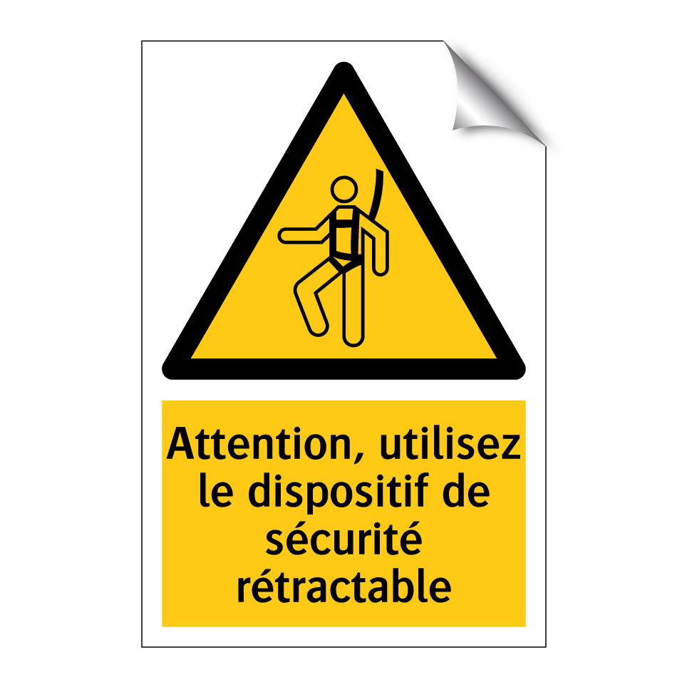 Panneau d'avertissement avec le texte : "Attention, utilisez le dispositif de sécurité rétractable"