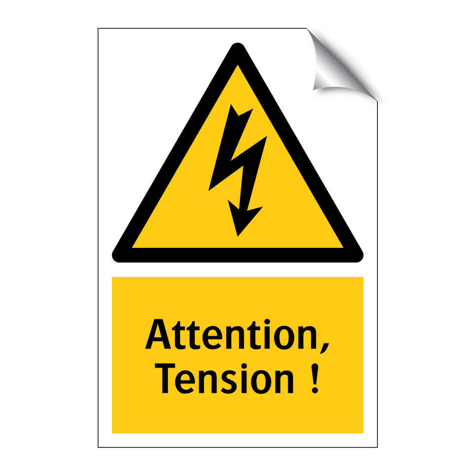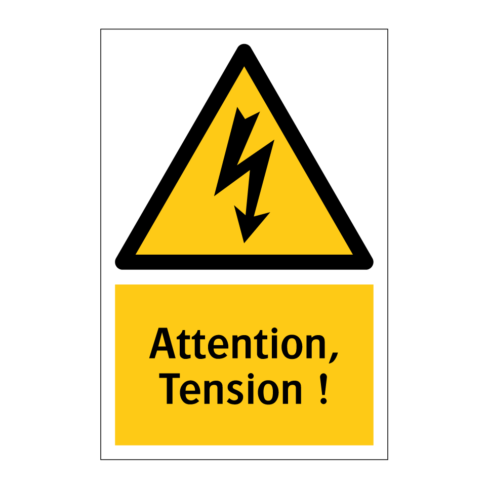 Panneau d'avertissement avec le texte : "Attention, Tension !"