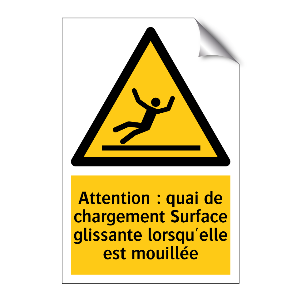 Panneau d'avertissement avec le texte : "Attention : quai de chargement Surface glissante lorsqu'elle est mouillée"