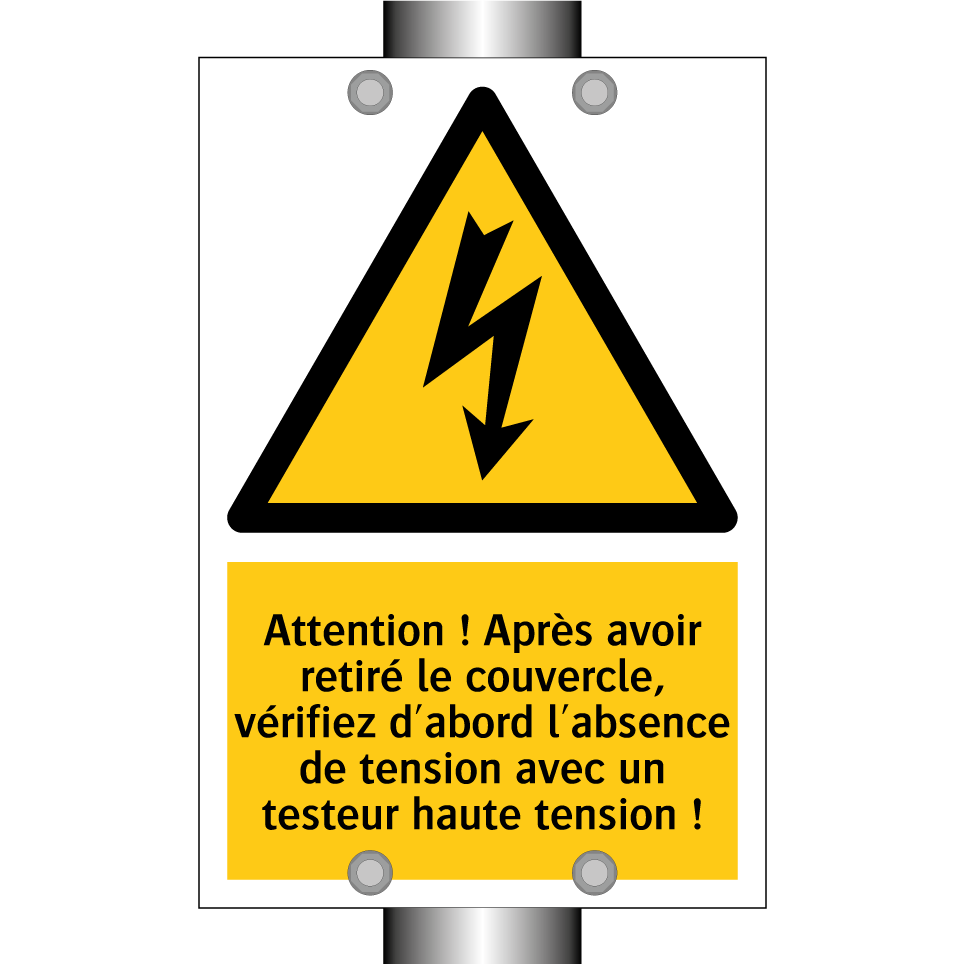 Panneau d'avertissement avec le texte : "Attention ! Après avoir retiré le couvercle, vérifiez d'abord l'absence de tension avec un testeur haute tension !"