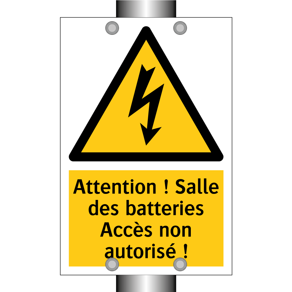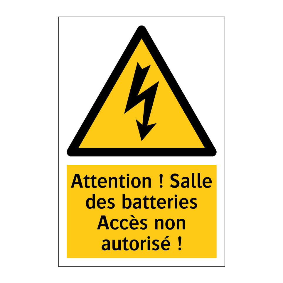 Panneau d'avertissement avec le texte : "Attention ! Salle des batteries Accès non autorisé !"