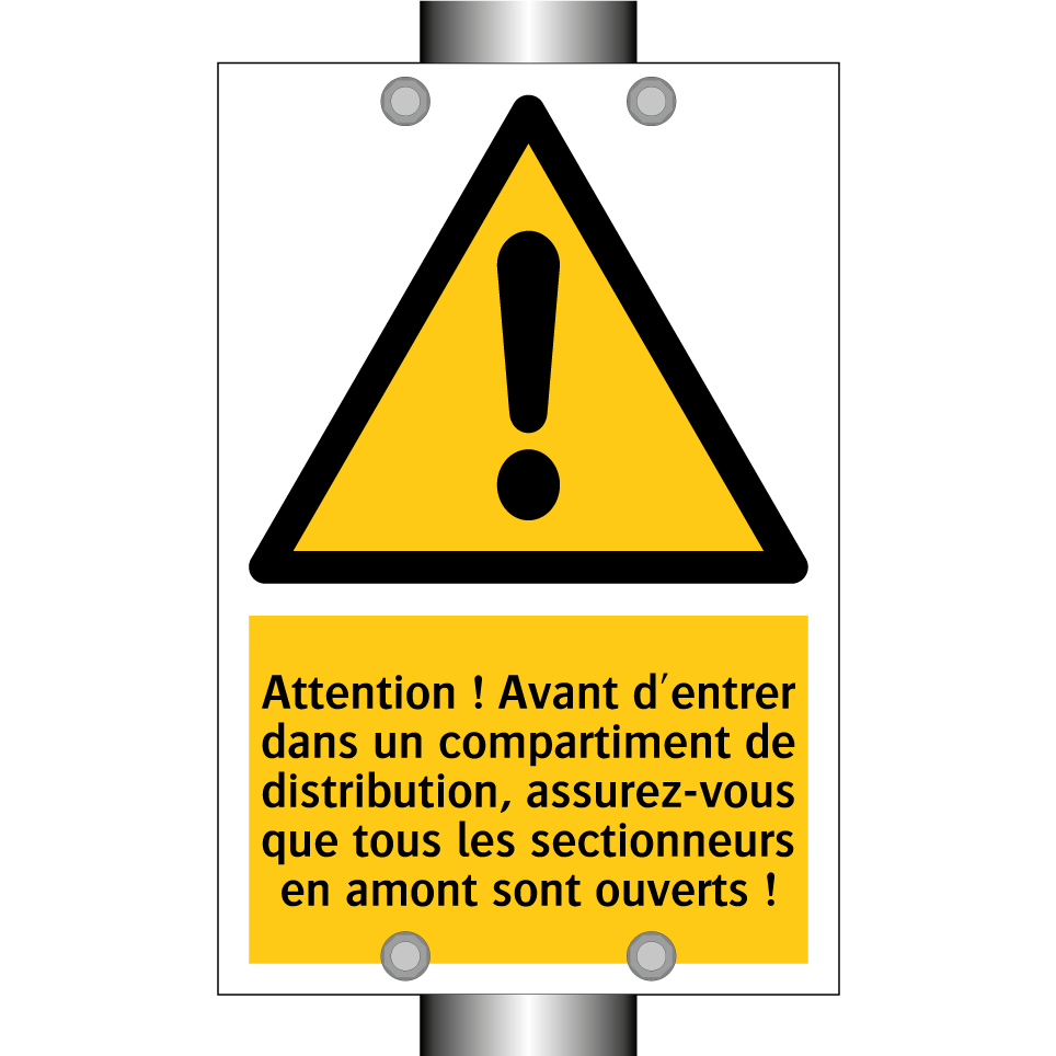 Panneau d'avertissement avec le texte : "Attention ! Avant d'entrer dans un compartiment de distribution, assurez-vous que tous les sectionneurs en amont sont ouverts !"