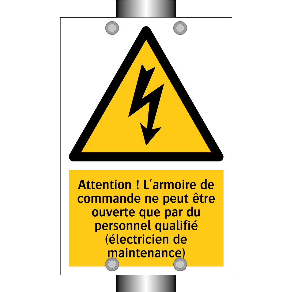 Panneau d'avertissement avec le texte : "Attention ! L'armoire de commande ne peut être ouverte que par du personnel qualifié (électricien de maintenance)"