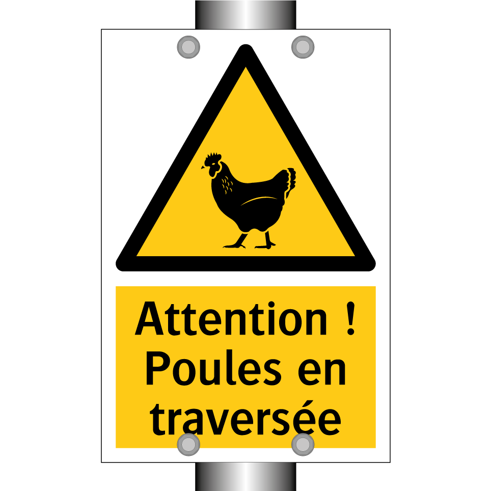Panneau d'avertissement avec le texte : "Attention ! Poules en traversée"