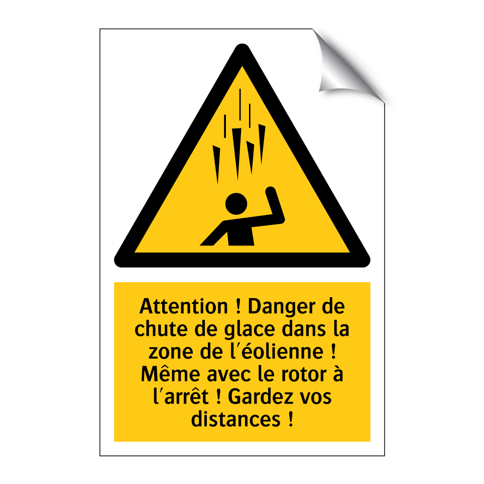 Ce panneau d'avertissement est essentiel pour garantir la sécurité autour des éoliennes. Conçu pour signaler le risque de chute de glace, il est idéal pour être placé à proximité des installations éoliennes, où le danger est présent même lorsque le rotor est immobile. En installant ce panneau, vous informez efficacement les passants et le personnel de maintenir une distance de sécurité. Sa couleur jaune vive et son symbole distinctif attirent immédiatement l'attention, assurant que le message de prudence est bien compris. Ce panneau est indispensable pour prévenir les accidents et protéger les personnes dans les zones à risque.