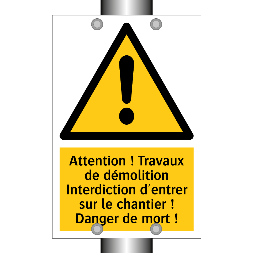 Panneau d'avertissement avec le texte : "Attention ! Travaux de démolition Interdiction d'entrer sur le chantier ! Danger de mort !"
