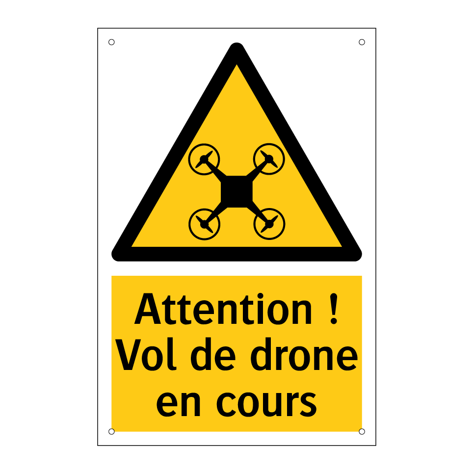 Panneau d'avertissement avec le texte : "Attention ! Vol de drone en cours"