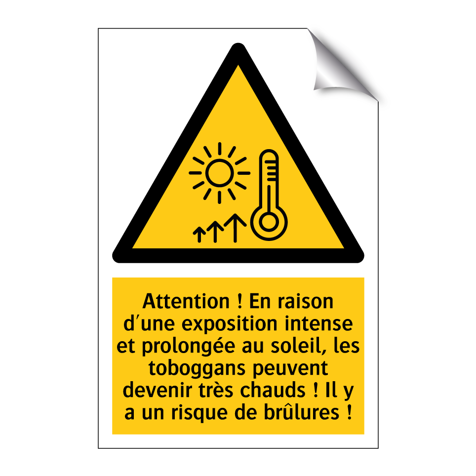 Panneau d'avertissement avec le texte : "Attention ! En raison d'une exposition intense et prolongée au soleil, les toboggans peuvent devenir très chauds ! Il y a un risque de brûlures !"