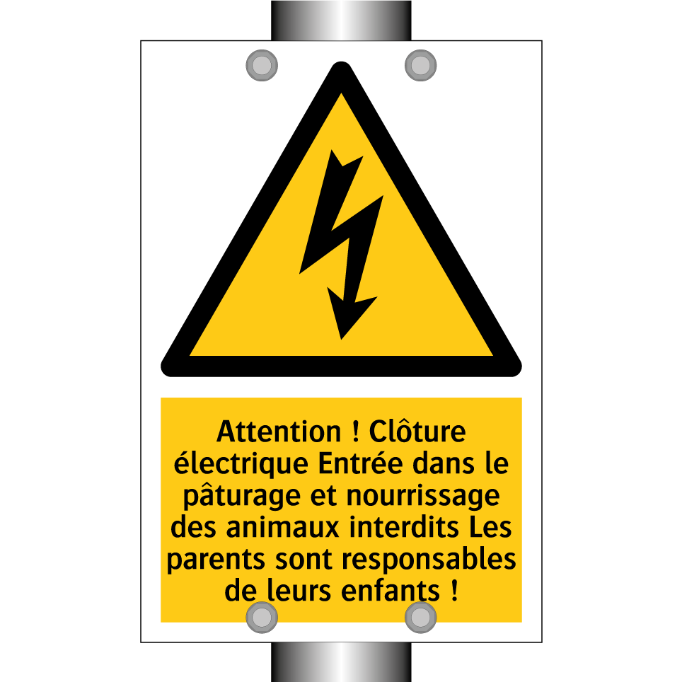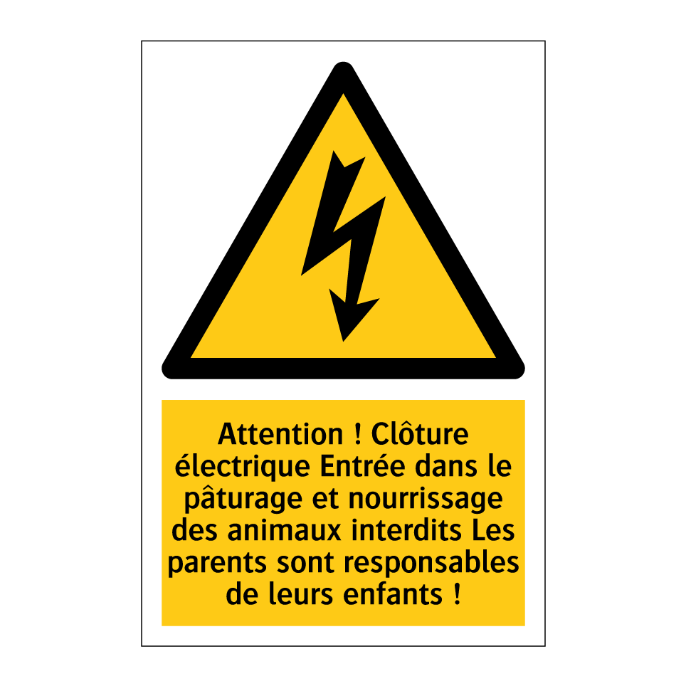 Panneau d'avertissement avec le texte : "Attention ! Clôture électrique Entrée dans le pâturage et nourrissage des animaux interdits Les parents sont responsables de leurs enfants !"