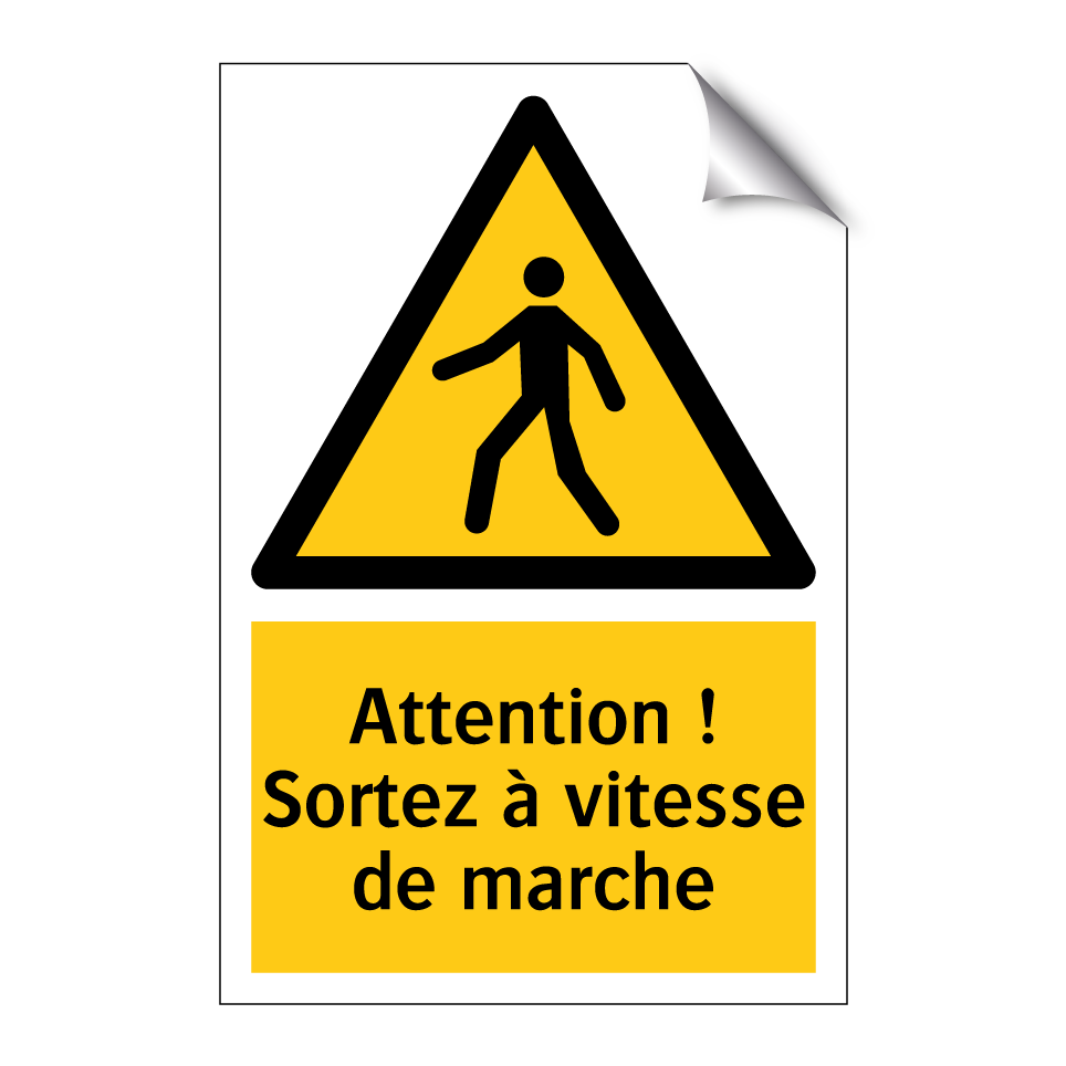 Panneau d'avertissement avec le texte : "Attention ! Sortez à vitesse de marche"