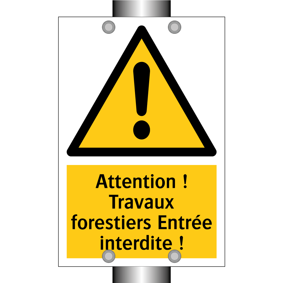 Panneau d'avertissement avec le texte : "Attention ! Travaux forestiers Entrée interdite !"