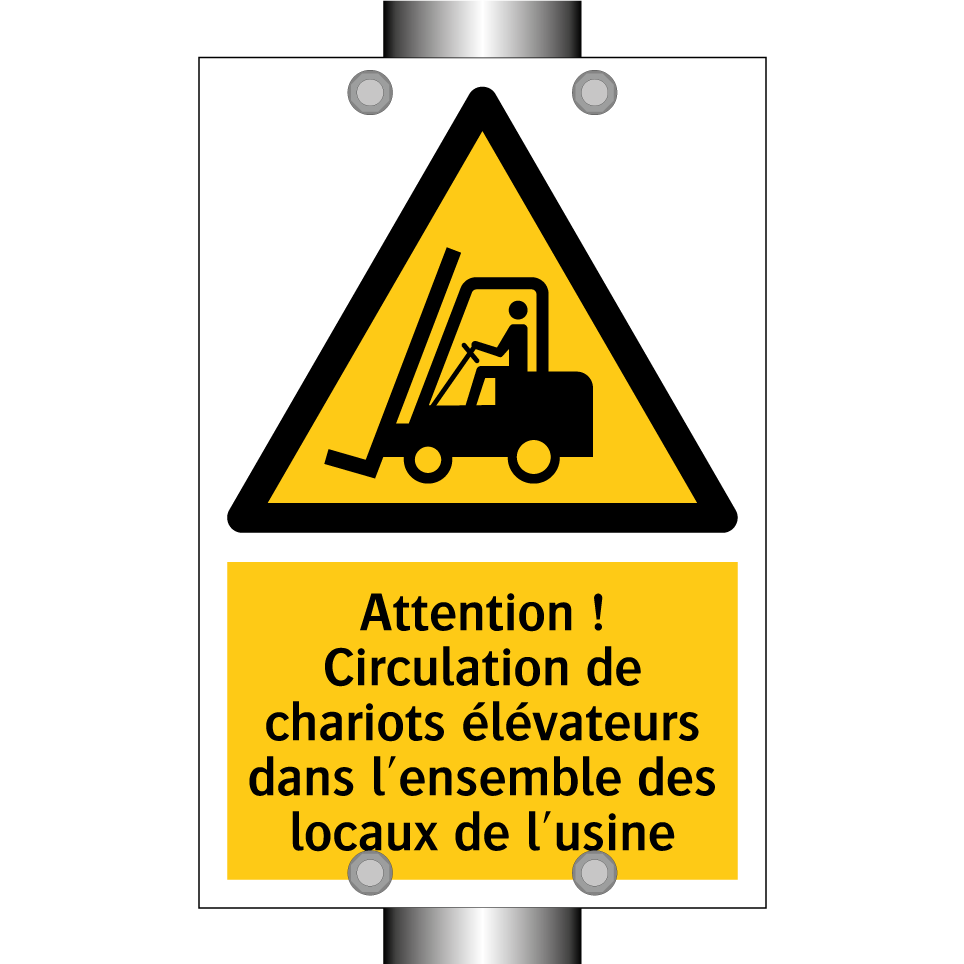 Panneau d'avertissement avec le texte : "Attention ! Circulation de chariots élévateurs dans l'ensemble des locaux de l'usine"